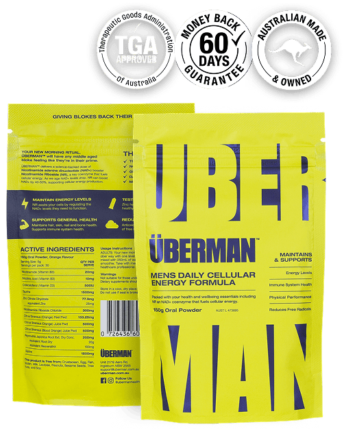 Welcome to ÜBERMAN® – the trusted, TGA-approved daily formula created to restore your energy and support your health, with clinically backed ingredients NR and NAD+ coenzyme. And if you don’t feel the difference within 60 days, we’ll give you your money back*. No hassle. No risk.