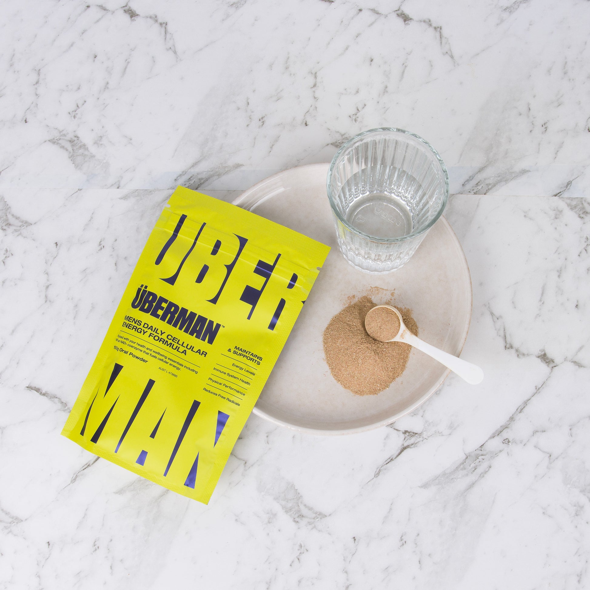 Start your day the über way with one man scoop of ÜBERMAN® (30g) mixed in a cool glass of water, juice or your favourite smoothie. By making ÜBERMAN® part of your morning ritual, you’re not only quenching your thirst; you’re providing your body with the essential vitamins and minerals it needs to promote energy and vitality. It's a simple, refreshing way to kickstart your morning and fuel your day.